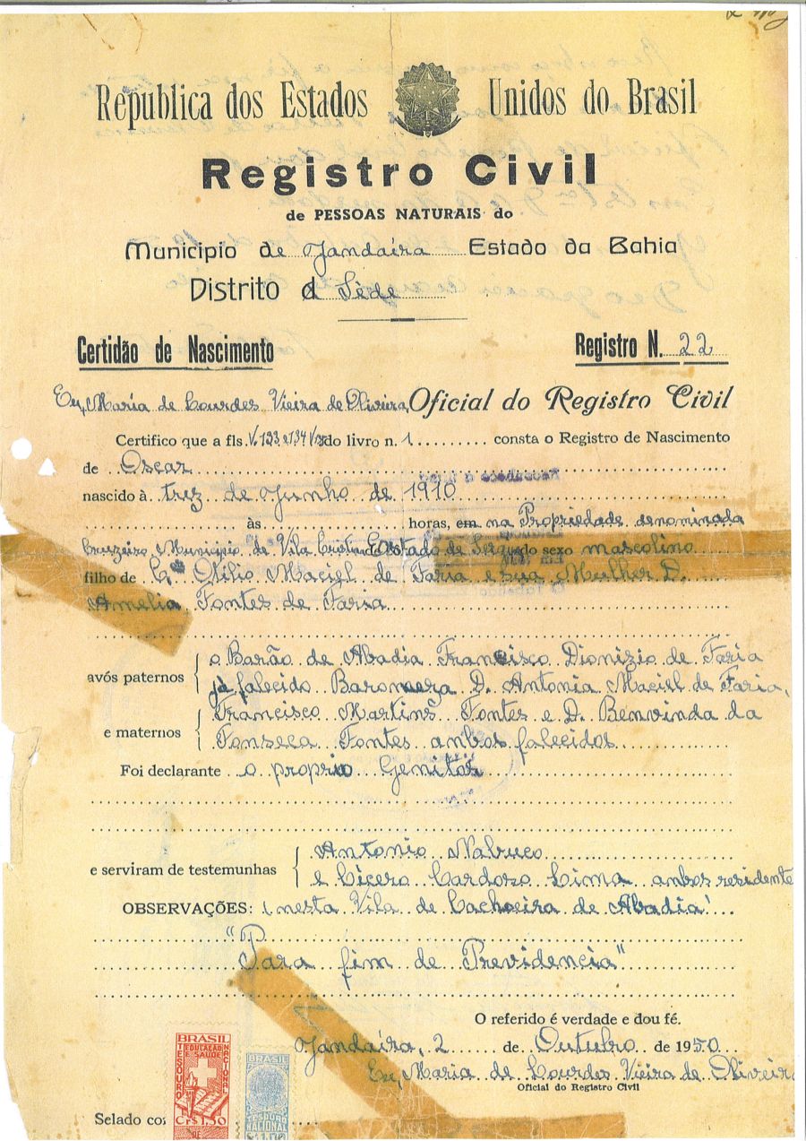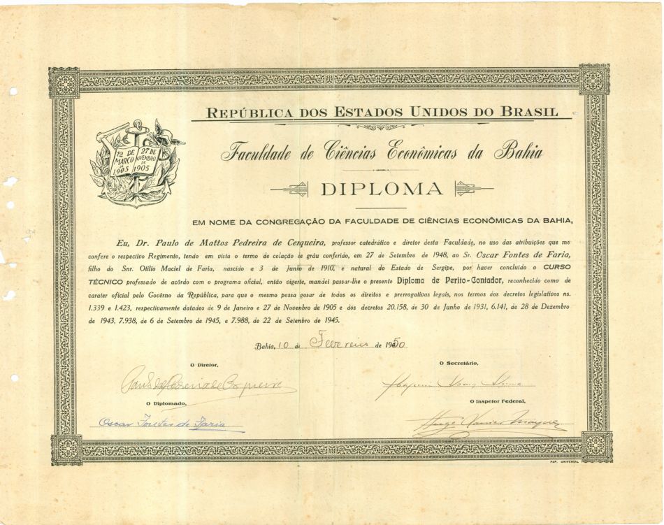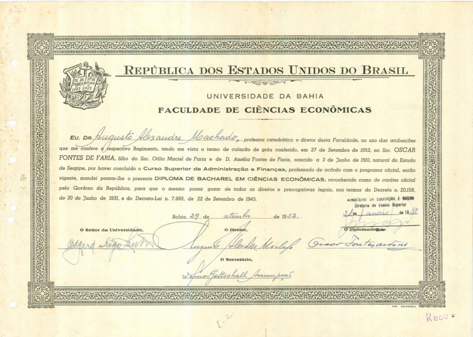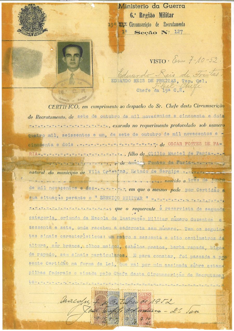 Entre os anos de 1922 e 1925, Oscar Fontes de Faria cursou o primário nas cidades do Conde e Esplanada, no estado da Bahia. De 1927 a 1930 fez o secundário no Ginásio da Bahia em Salvador. Tornou-se um jovem questionador, ativo, participativo, humanista, idealista, preocupado com o destino de seu país.